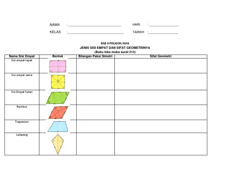 Lingkaran mempunyai simetri lipat yang jumlahnya tak terhingga, karena lingkaran bisa dibagi dua dengan jumlah tak terhingga dengan banyak. Kemungkinan keempat diperoleh ketika kita memutar lukisan tersebut sejauh 360°. Memiliki 4 simetri lipat , 4 simetri putar, dan 4 sumbu simetri. Simetri putar pada tingkat empat. Belah ketupat merupakan segi empat yang memiliki empat buah rusuk yang memiliki panjang yang sama dan memiliki dua pasang sudut yang berhadapan sama. Jumlah simetri lipat = 1 jumlah simetri putar = 1 b. Tetapi yang terakhir mesti berserenjang. Berikut ini simetri lipat pada segienam beraturan. Sisinya yang terpanjang dikenali sebagai panjang. Simetri lipat adalah jumlah lipatan yang membuat suatu bangun datar terbagi menjadi dua bagian yang sama. Trapesium adalah segi empat yang mempunyai tepat sepasang sisi yang berhadap sejajar. Lukis dan nyatakan bilangan paksi simetri pada setiap bentuk 2 dimensi di bawah. Dan yang terpendek dikenali sebagai lebar.