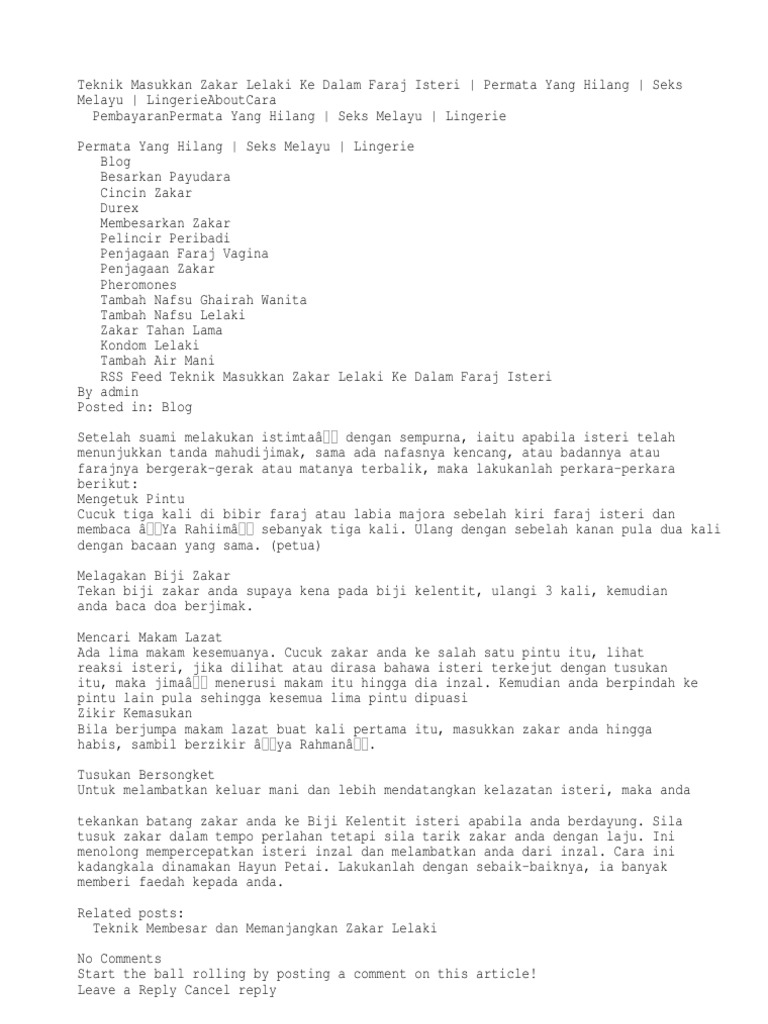 Alat besarkan zakar (10) artikel (193) besarkan payudara (6) cerahkan payudara (2) cincin zakar (7) kecantikan (3) ketatkan faraj (4) ketatkan faraj (4) kurus (3) mati pucuk (4) pelincir faraj (2) pemikat lelaki (2) pemikat wanita (3) perangsang nafsu wanita (9) Cara ini penting dalam mendapatkan titik rangsangan awal supaya kesemua reseptor saraf deria yang terdapat di dinding faraj dapat dirangsang terlebih dahulu secara maksimum agar dapat memberikan kenikmatan yang lebih kepada isteri. Ya, mungkin anda berpandangan persoalan ini merupakan suatu yang remeh dan sebenarnya senang saja untuk. Isteri akan berada di dalam keadaan nikmat dan sakit yang meningkat dan menurun semasa proses memecah dara. Jangan secara kasar untuk kali pertama. Anda akan dapat melihat anak mata isteri sudah 'menghilang' dan memandang ke atas. Mencari makam lazat ada lima makam kesemuanya. Cara memasukkan zakar ke faraj isteri ketika jimak. Tusukkan pada permulaan haruslah dituju ke dinding sebelah kanan dan kiri dalam faraj. Melagakan biji zakar tekan biji zakar anda supaya kena pada biji kelentit, ulangi 3 kali, kemudian anda baca doa berjimak. Cara yang betul memasukkan zakar ke faraj. Cara masukkan zakar dalam faraj isteri. Sesudah itu anda boleh meneruskan tujahan zakar ke bahagian tengah, atas bahagian dinding serta bawah dinding faraj isteri anda.