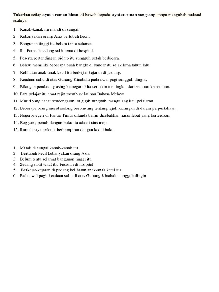 Susun ayat biasa menjadi ayat songsang. Ayat songsang ada pelbagai bentuk; Semua buku di rak itu telah dibaca oleh saya. Bapa ali ialah seorang petani. Ayat songsang kepada ayat biasa spm. Susunan ayat biasa dan susunan ayat songsang cute766. (1) peserta pertandingan pidato itu sungguh petah berbicara. 3 bangunan tinggi itu belum tentu selamat. Susunan ayat biasa dan susunan ayat songsang cute766. (iii)negeri negeri di pantai timur dilanda banjir disebabkan hujan lebat yang berterusan. Jika anda menambah perkataan atau imbuhan ayat songsang anda salah dari segi binaannya. Guru sayalah lelaki yang berbaju putih itu. Pegawai itu masih belum sampai untuk majlis kerasmian ini.