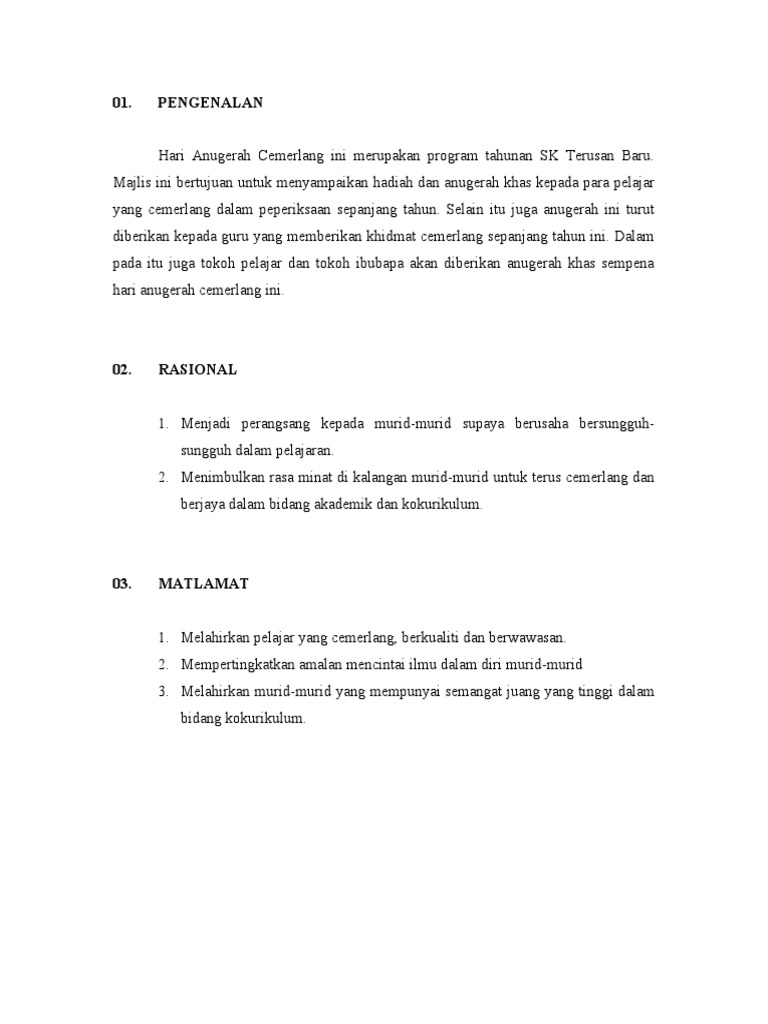 Teks pengacara majlis hari anugerah kecemerlangan. Hari q dan majlis penutupan bulan kebangsaan skkm 2017. Download contoh kertas kerja hari anugerah pendidikan sekolah. Kertas cadangan majlis anugerah cemerlang. Pelajar cemerlang penjana pendidikan gemilang tempat : 11 mei 2014/11 rejab 1435h (ahad) tema : Kali ini, kami kongsikan kertas kerja dan buku program berkenaan dengan majlis anugerah murid / pelajar cemerlang ataupun majlis apresiasi murid. Kecemerlangan pelajar mencerminkan perkembangan serta kemajuan sekolah. Baik dari yang paling sederhana hingga kertas berharga. Sebenarnya hari anugerah ini bukan sahaja meraikan mereka yang cemerlang dalam bidang akademik sahaja, mereka yang oleh yang demikian kita memerlukan kertas kerja hari anugerah kecemerlangan yang baik untuk memastikan program tersebut berjalan dengan lancar dan tersusun. Documents similar to kertas kerja hari anugerah cemerlang 2008. Anugerah pelajar cemerlang tokoh murid. Globalisasi & mahasiswa oleh :